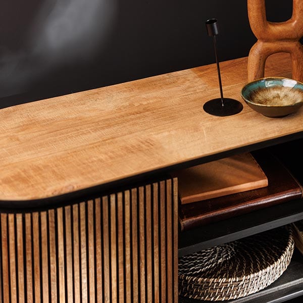 A statement piece that seamlessly merges durability and style, the wide sideboard offers ample storage space and display options, making it a versatile addition to any space. Expertly crafted from reclaimed, solid teak wood and pine strips, this beautiful sideboard is graced with natural warmth and grains that the material offers, while the design-led legs provide stability. Its wide surface provides an ideal space for displaying decorative items, allowing you to personalise your space.