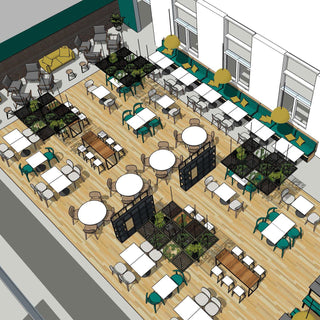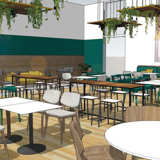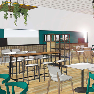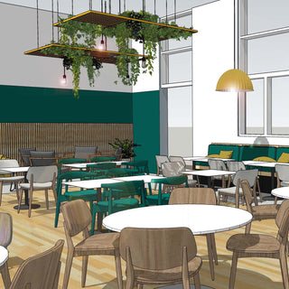 Working with our partner interior designer, we helped to design and supply contract restaurant furniture for a complete transformation of the large onsite cafe at the venue creating a stunning, Scandi style vibe.